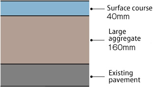 This asphalt mixture is made with large coarse aggregates with a maximum particle diameter of over 25mm (1.0in). The meshing effect of large aggregates supports loads and provides excellent resistance to deformation. In addition, since each leveled layer can be made thicker than conventional pavement, this mixture is frequently used to implement the thick-lift method for rapidly replacing pavement.