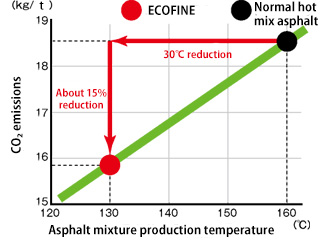 Examples in which ECOFINE and a conventional Hot Mix Asphalt are compared in terms of CO2 emissions and production temperatures