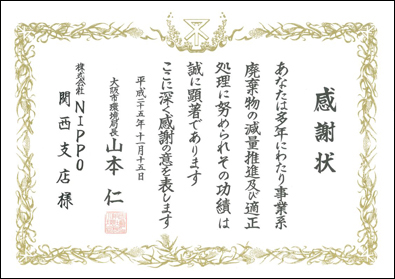 当社 関西支店は、大阪市環境局長より感謝状を授与されました。