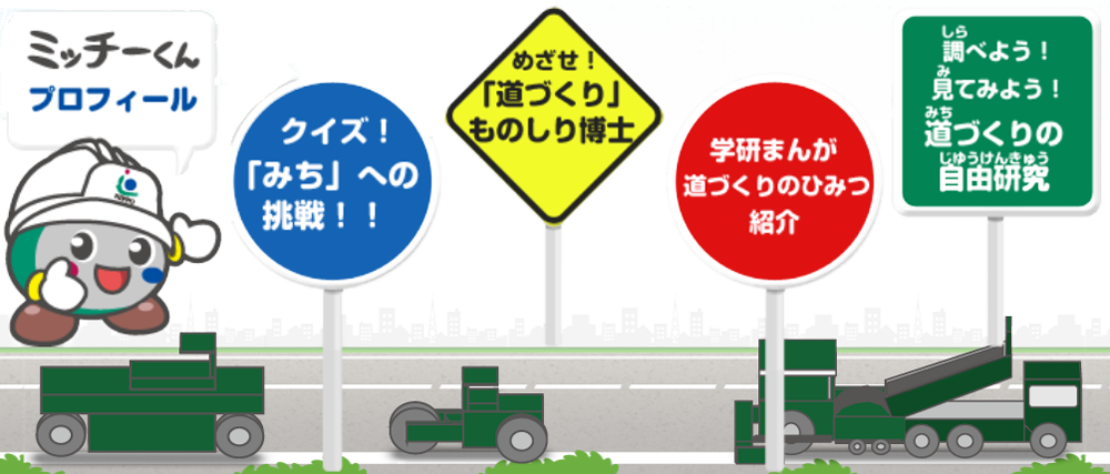私達 ( わたしたち ) が 毎日通 ( まいにちとお ) る 道 ( みち ) 、さまざまな 物 ( もの ) が 運 ( はこ ) ばれる 道 ( みち ) 、 快適 ( かいてき ) な 環境 ( かんきょう ) をつくる 道 ( みち ) ‥‥、 道 ( みち ) にはいろいろな 役割 ( やくわり ) があります。 普段当 ( ふだんあ ) たり 前 ( まえ ) のように 通 ( かよ ) っている 道 ( みち ) は どんなつくりになっているのか、どうつくるのか、 「 道 ( みち ) づくりのひみつ」を 探検 ( たんけん ) していきましょう!