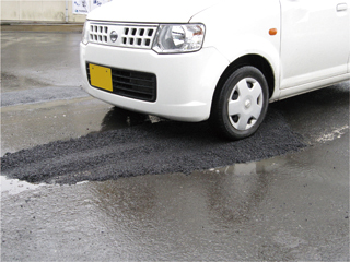 汎用品「レミファルト」の性能を大きく改善した、新しい全天候・高耐久型道路補修材です。