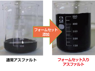 特殊添加剤「フォームセット」を用いて、製造時の混合性や舗設時の締固め性を向上させたアスファルト混合物です。通常と同等の作業性で製造温度を約30℃下げる場合(中温化)と、製造温度を下げずに高い作業性の混合物とする場合(施工性改善)とがあります。