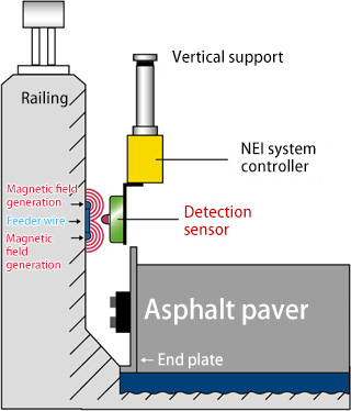 This system automatically controls the pavement height on bridge deck slabs by using magnetic fields generated by weak electrical currents. With no need to install string lines to control an asphalt paver, it is possible to improve safety, carry out high-precision paving work, rationalize the work that is performed, and make labor-saving decisions.