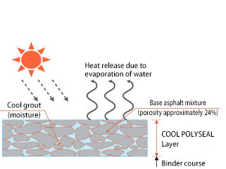 - Function for inhibiting increases in the temperature: The heat of the evaporation of moisture is used to inhibit increases in the temperature of the road surface.