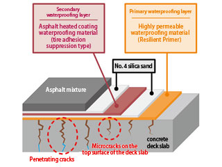 This is the road bridge slab waterproofing method* that can be expected to provide exceptional waterproofing and reinforcement effects through the combined use of a highly permeable waterproofing material that deeply penetrates into and adheres to penetrating cracks and fine cracks in concrete slabs and an asphalt-heated coating for the waterproofing material. Because application and curing times are short, this method is suitable for repairing bridge surface pavements where time constraints apply.