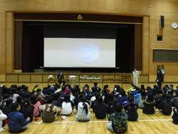 当日は、同校5年生5クラス約160名の児童が体育館に集合。まず、NEXCO中日本 工務課 黒田 勇樹様より、「道路の役割」と題して、高速道路の役割や工程、働くくるまの紹介、さらに、菰野町に新設されるインターチェンジについてわかりやすく説明。続いて当社より、道路の役割や歴史、舗装工事の流れなどを親しみやすく紹介しました。児童の皆さんは興味深く熱心に聞き入って下さいました。