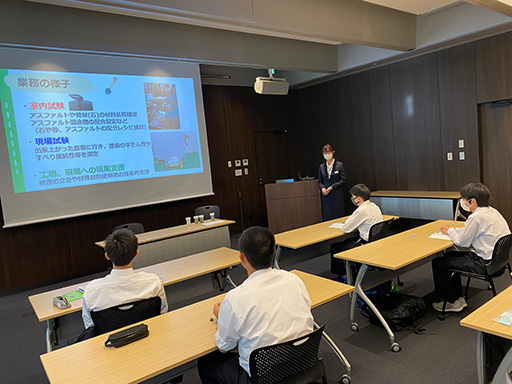会社概要の説明、舗装の基礎講座を行い、様々な実験やクイズを交えながら学んでもらいました。また若手社員が舗装工事現場、試験所での仕事内容を紹介し、働く楽しさ、やりがいなどを伝えました。このような機会を通して、「道づくり」の仕事に関心をもってくれることを期待します。